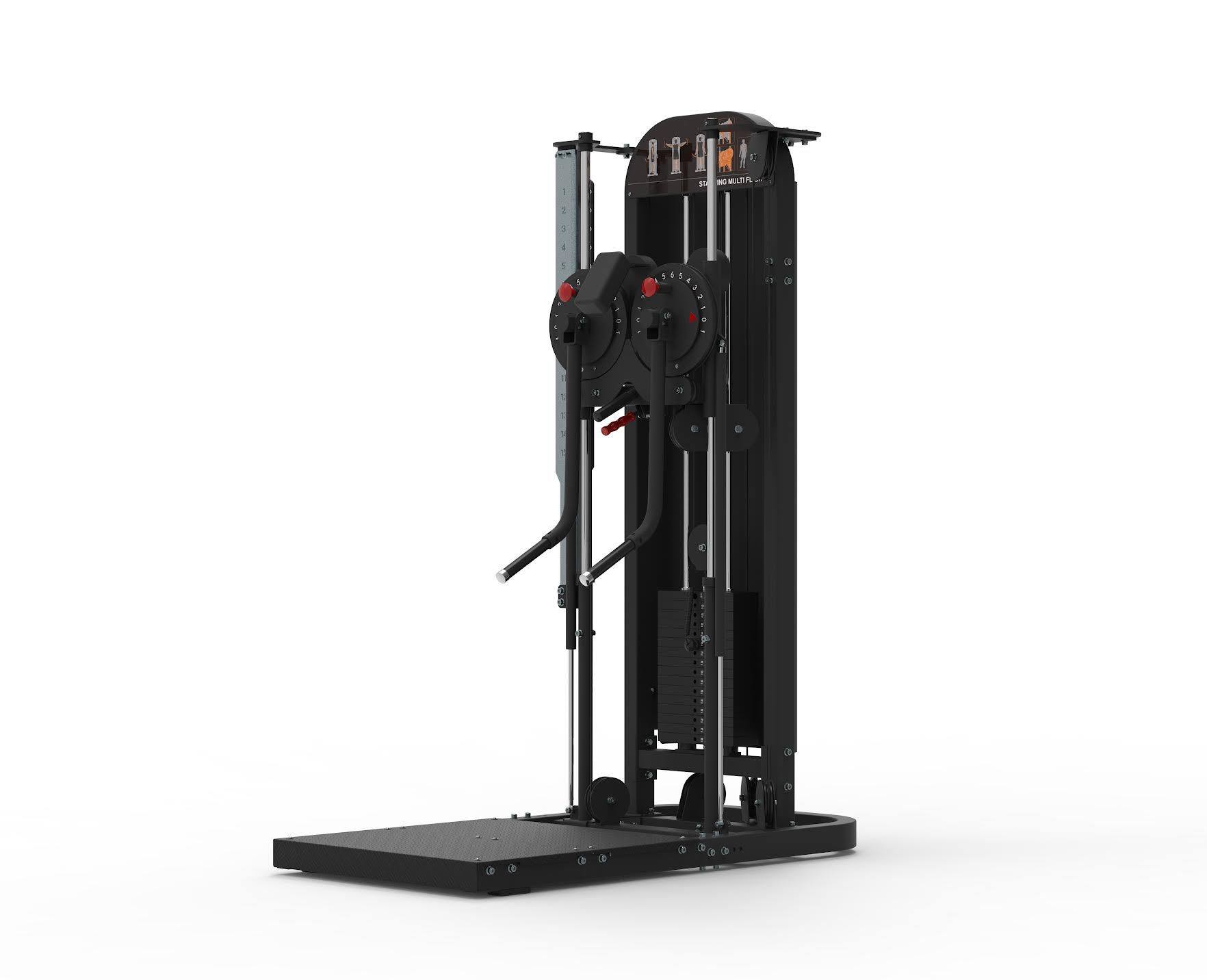 This unit weighs a total of 615 pounds. The dimensions are 59 length by 31 width by 77 inches height. This machine is designed for shoulder and back training.